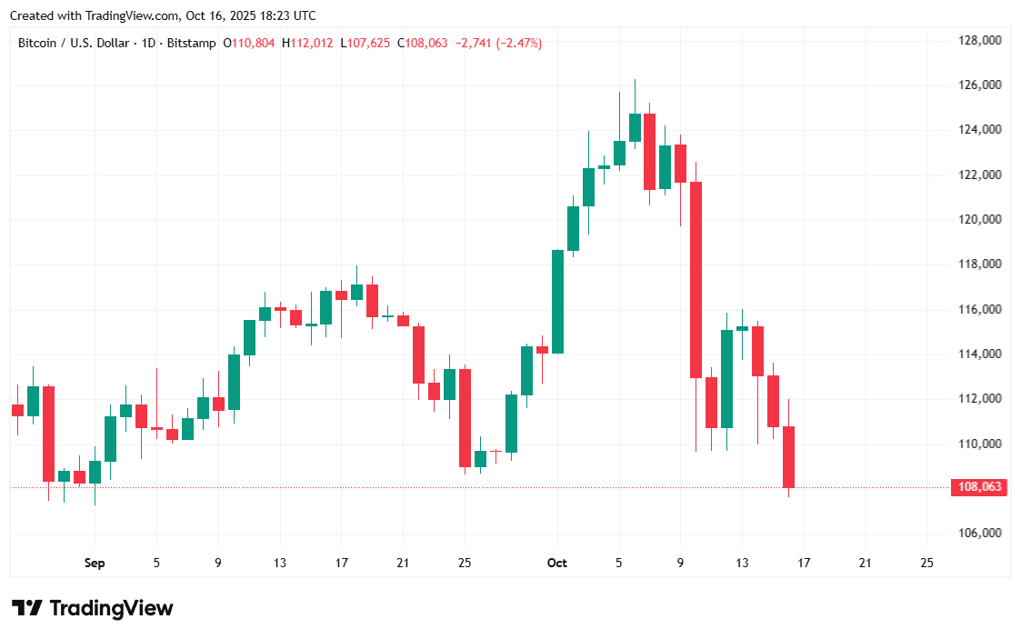 Цена ведущей криптовалюты упала ниже 108 000 долларов в четверг днем на фоне обострения трений между двумя крупнейшими экономиками мира.